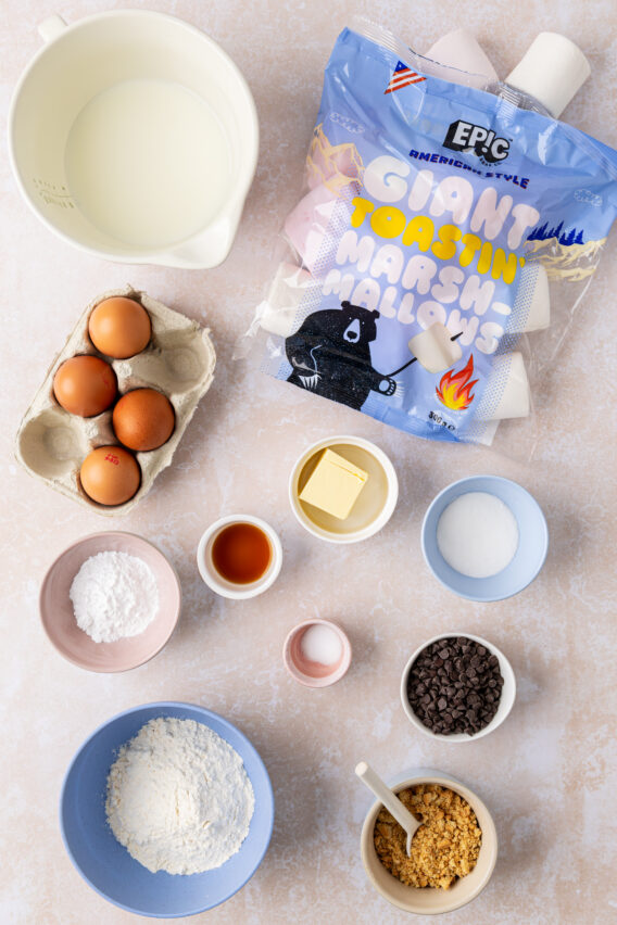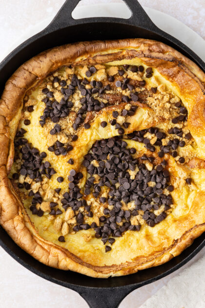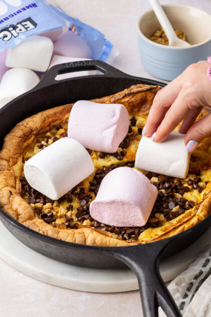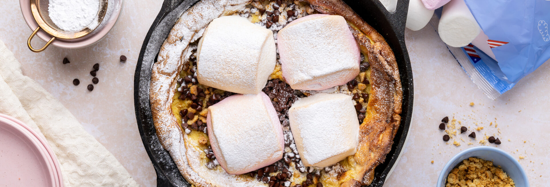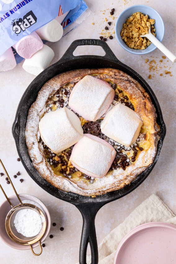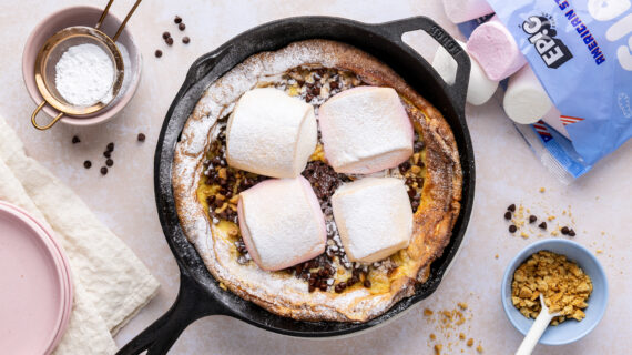 Somewhere between a pancake, yorkshire pudding and a soufflé, Dutch baby pancakes are cooked in the oven for that signature puff! They deflate as they cool down, making a delicious base for your toppings. This s’mores version combines crunchy biscuit crumbs, melty chocolate chips and Epic Snax Giant Marshmallows toasted to gooey perfection.
