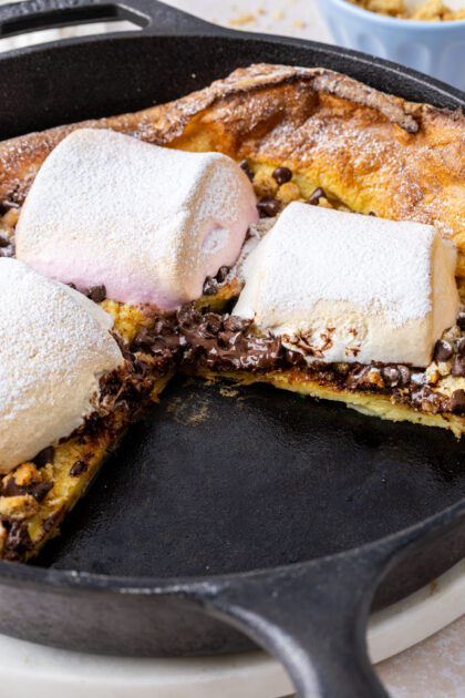 This S’mores Dutch Baby Pancake is such a fun pancake day twist, oh and you don’t have to use a skillet pan…an oven-safe frying pan will do the trick!